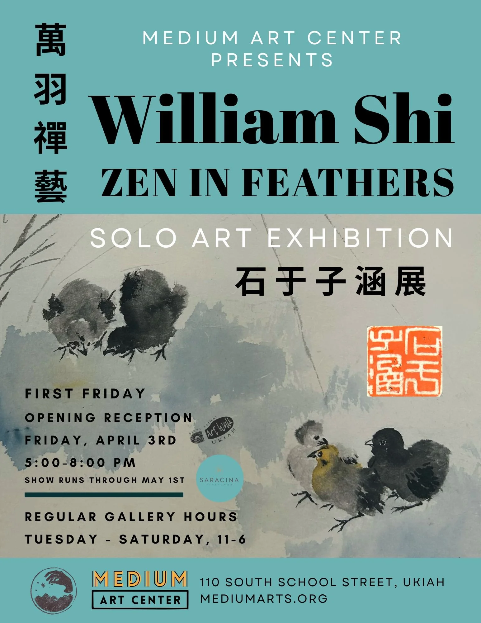 Ukiah, CA — MEDIUM Art Center is proud to present Zen in Feathers, a solo exhibition featuring the painting and ink work of William Shi. The exhibition opens during the First Friday Art Walk on April 3, 2026, from 5 to 8 p.m., with light refreshments, wine, and beer available by donation.